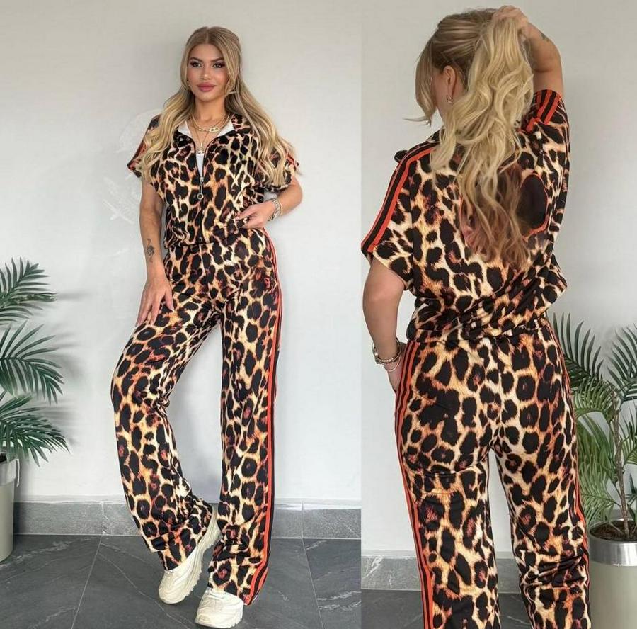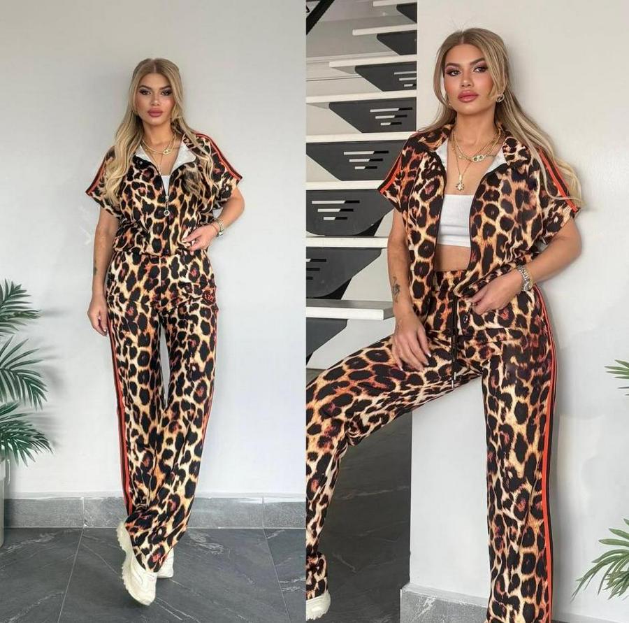 Dalgıç Kumaş Dijital Leopar Baskılı Şerit Detaylı Takım