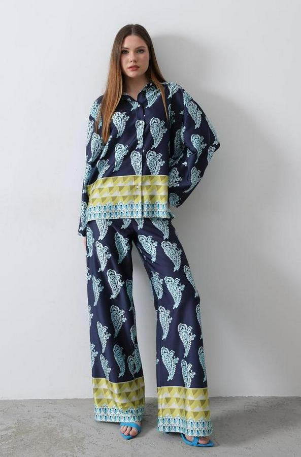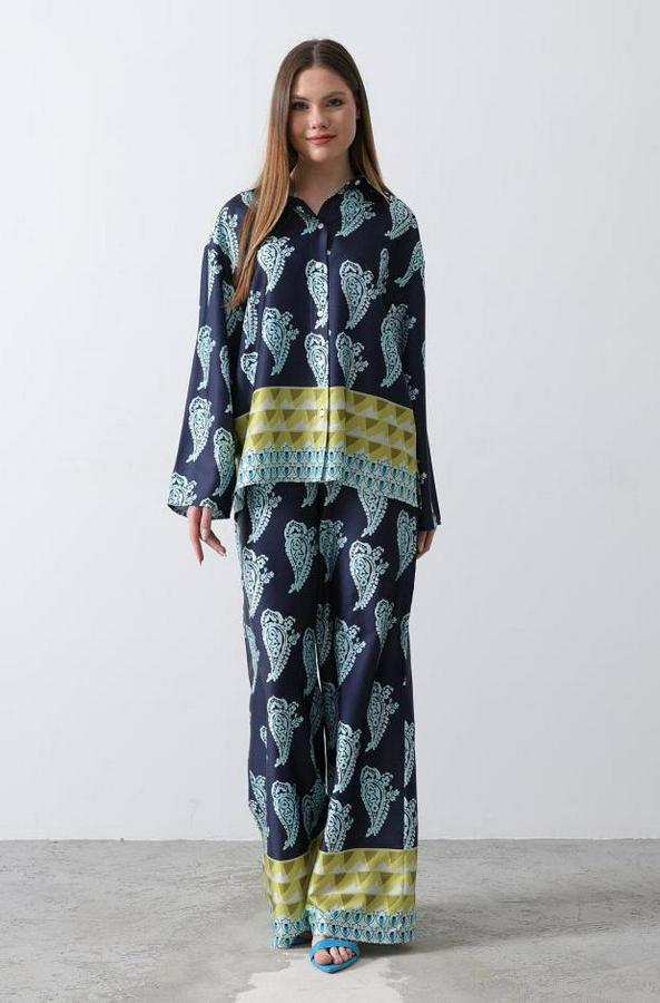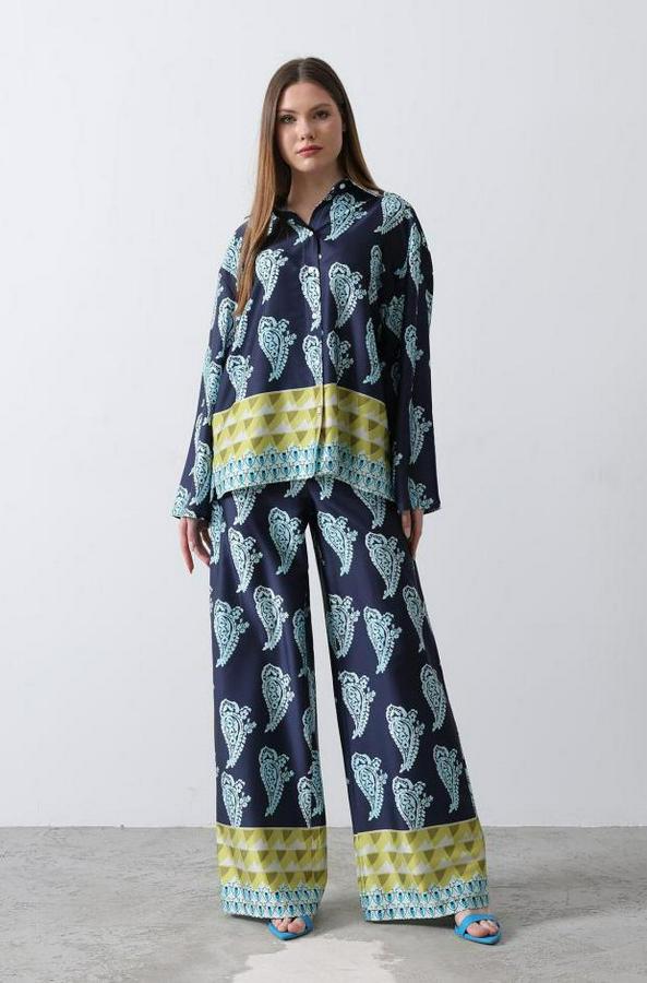 Desenli Saten Bol Takım - İndigo