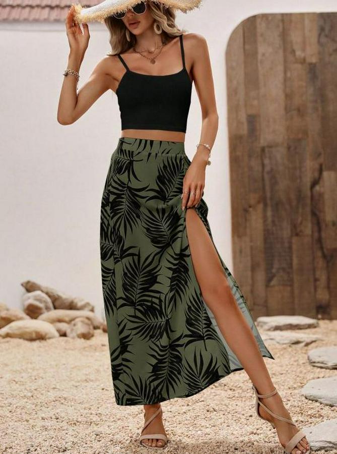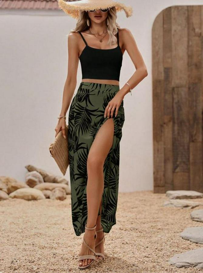 Kadın Ip Askılı Yuvarlak Yaka Kısa Viskon Bluz Ve Desenli Yırtmaçlı Süprem Etek Ikili Takım