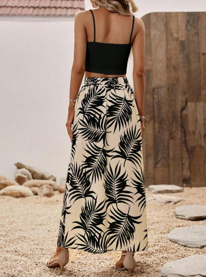 Kadın Ip Askılı Yuvarlak Yaka Kısa Viskon Bluz Ve Desenli Yırtmaçlı Süprem Etek Ikili Takım