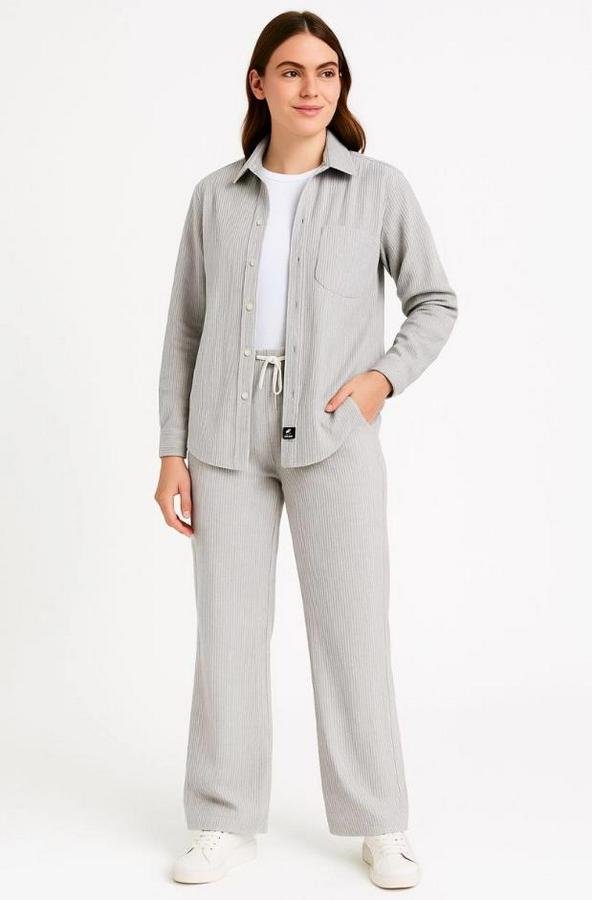 Kadife Oversize Takım – Gömlek Ve Pantolon İkili Set Füme Corduroy Şıklığı, Rahat Ve Zarif Duruş Yumuşak Dokulu Kadife Kumaş, Düğmeli Gömlek Üst Ve Lastikli Pantolon Alt Parça Ile Gün Boyu Konfor- Gri