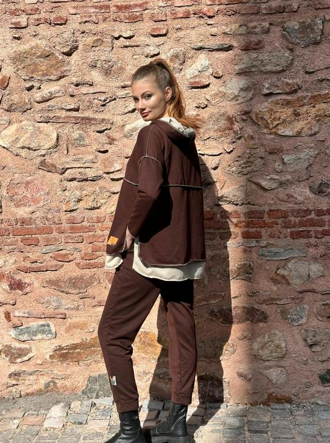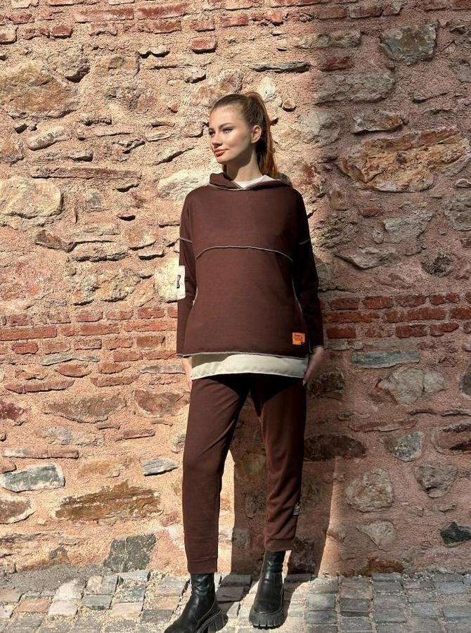 AnasayfaTüm ÜrünlerTakımlarAlt - Üst TakımKahve Kapşonlu Etek Ucu Detay Arma Ters Dikiş Gorunumlu Ikili Takım
