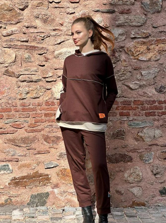 Kadın Kahve Kapşonlu Etek Ucu Detay Arma Ters Dikiş Gorunumlu Ikili Takım