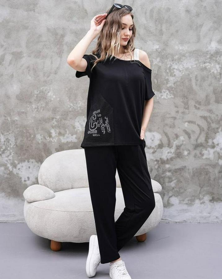 AnasayfaTüm ÜrünlerTakımlarAlt - Üst TakımKayık Yaka Baskı Detay Salaş Bluz Ve Yüksek Bel Pantolon Ikili Takım
