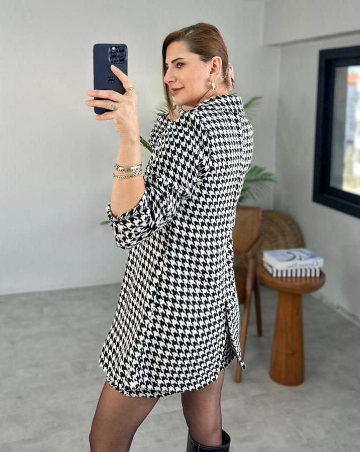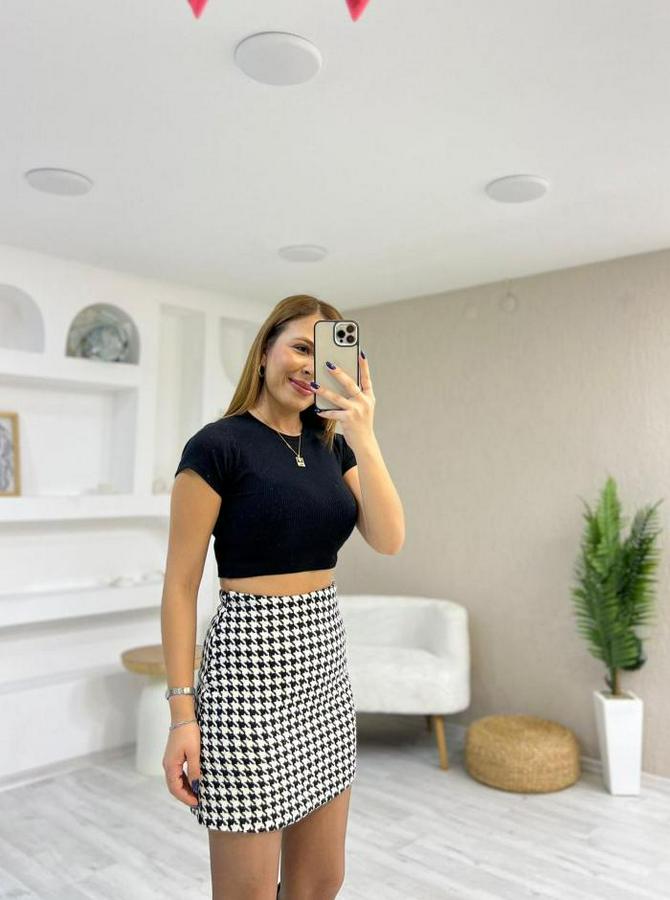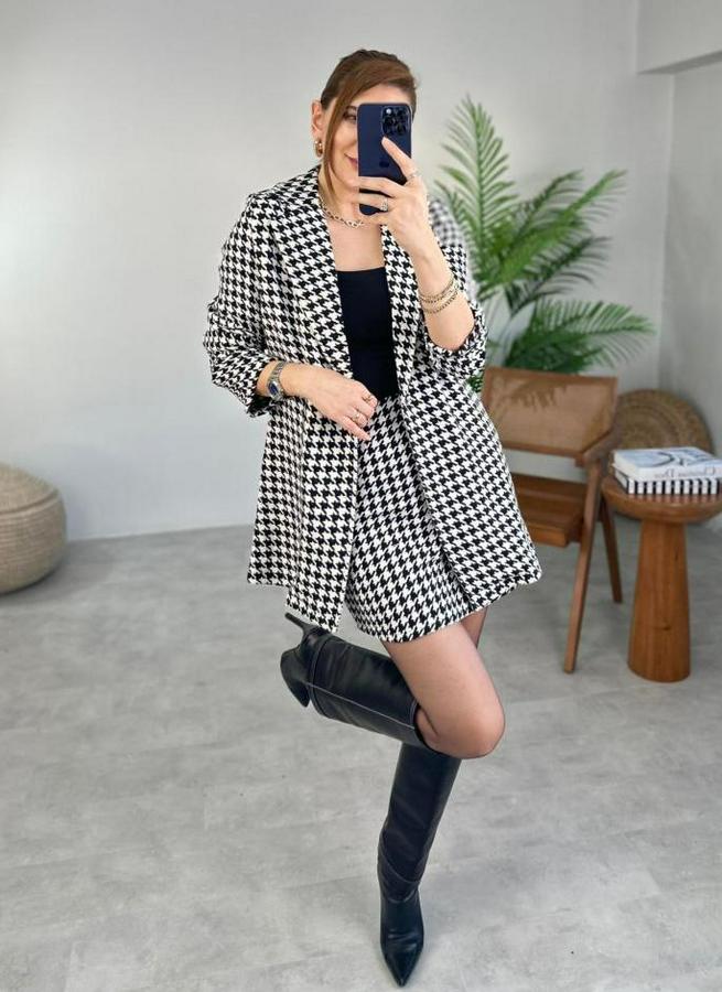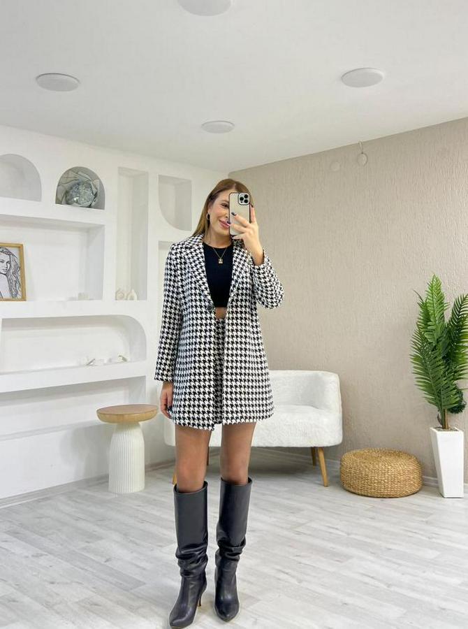 AnasayfaTüm ÜrünlerTakımlarAlt - Üst TakımKazayağı Desen Vatka Detay Kaban Ve Yüksek Bel Etek Ikili Takım
