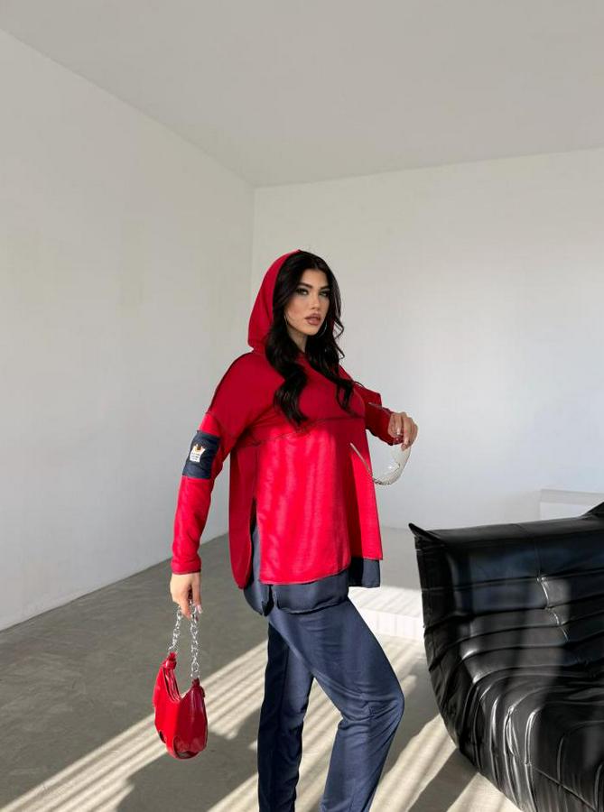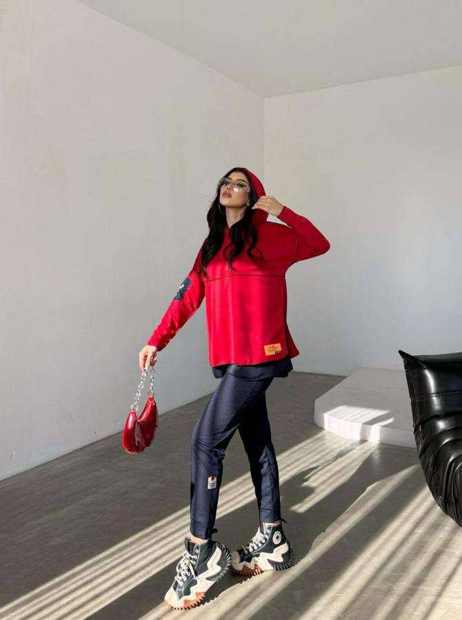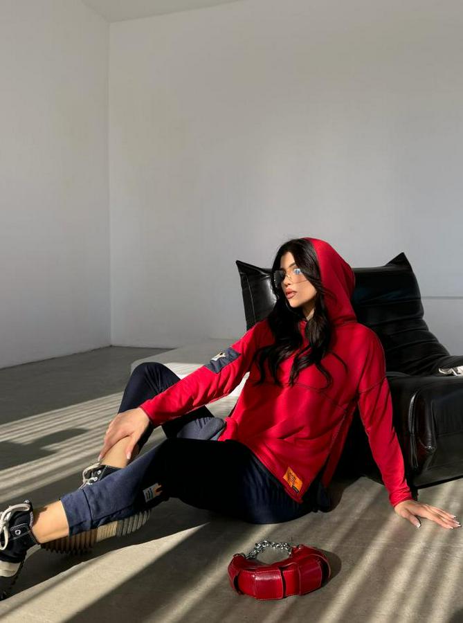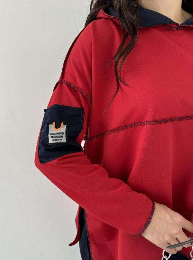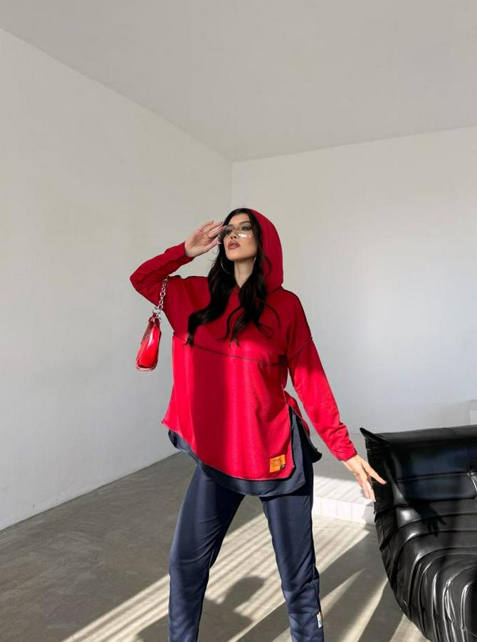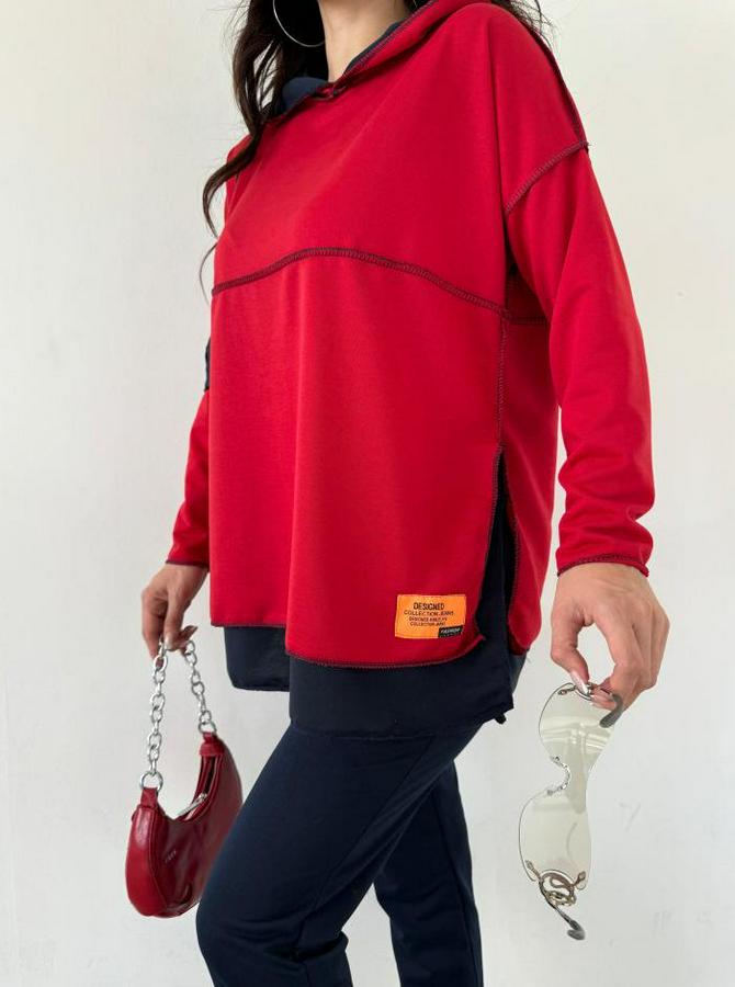 Kırmızı Kapşonlu Etek Ucu Detay Arma Ters Dikiş Gorunumlu Ikili Takım