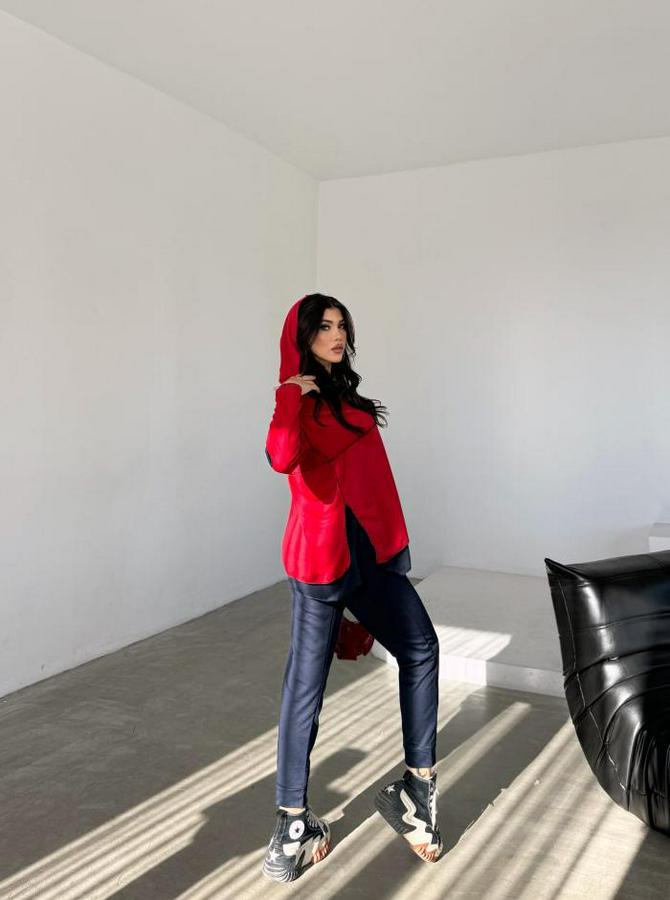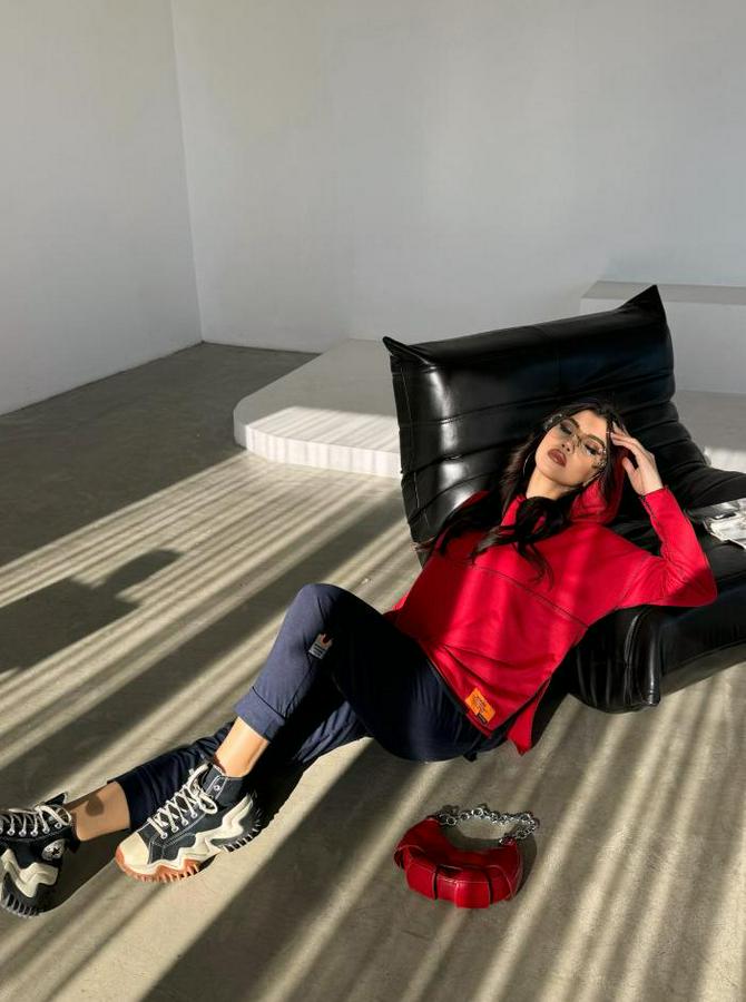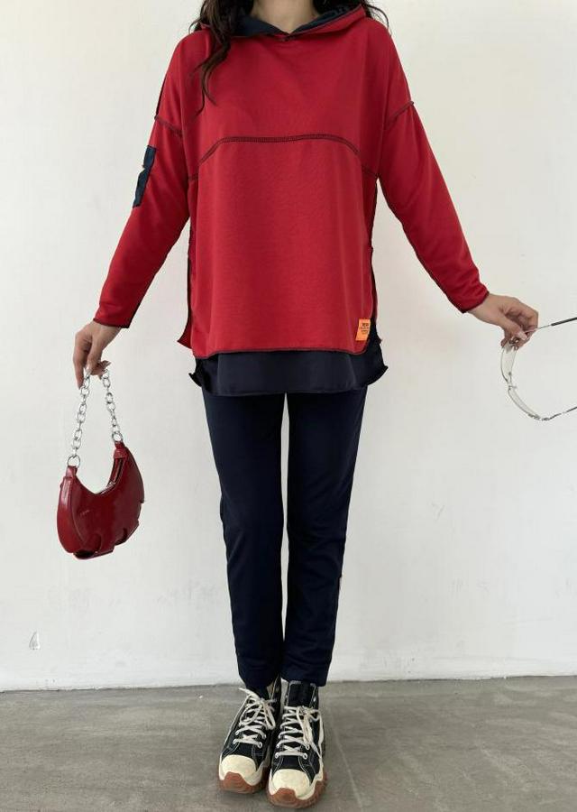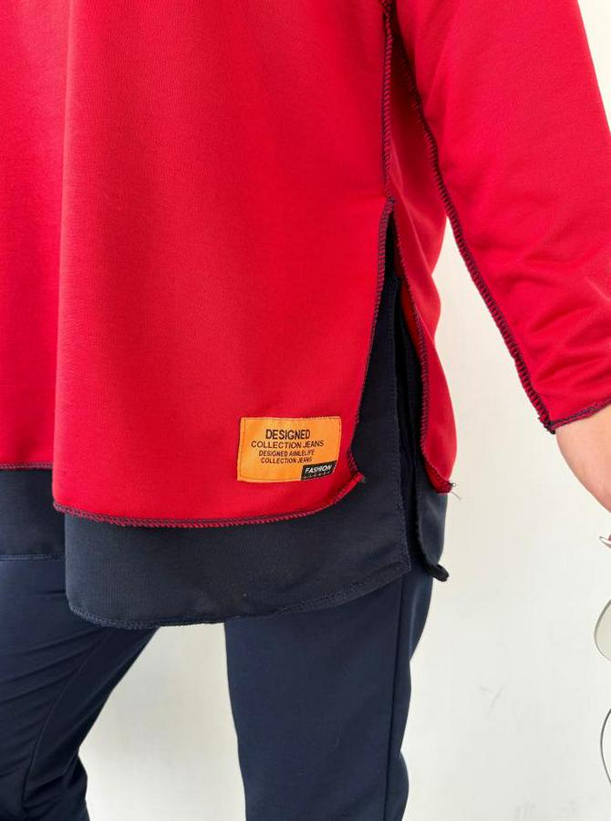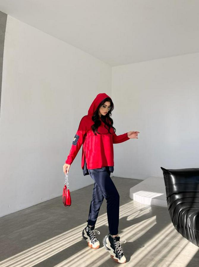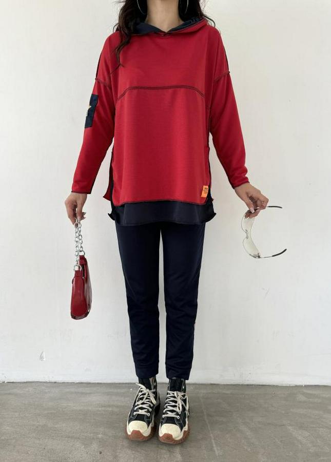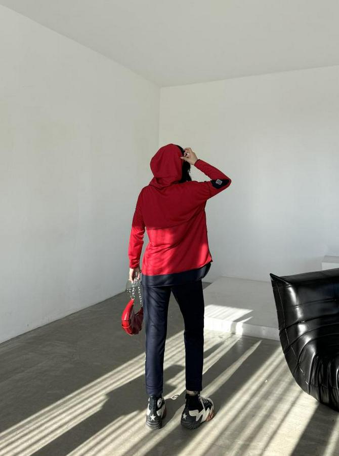 Kırmızı Kapşonlu Etek Ucu Detay Arma Ters Dikiş Gorunumlu Ikili Takım