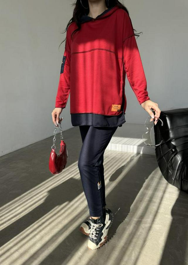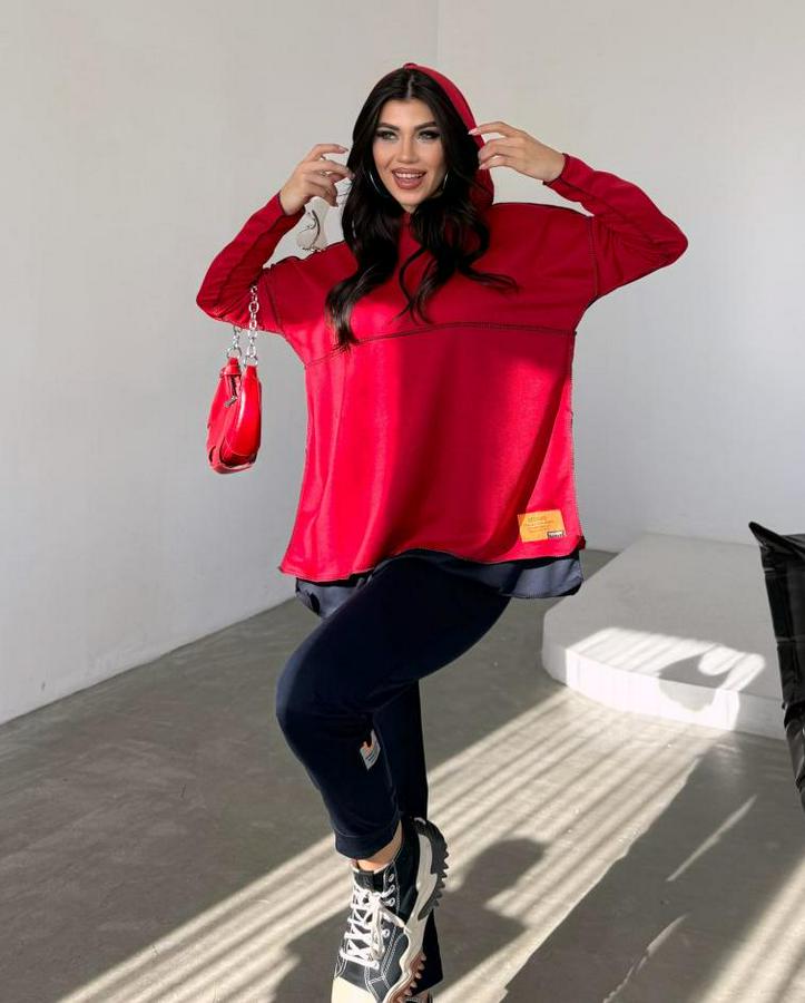 Kadın Kırmızı Kapşonlu Etek Ucu Detay Arma Ters Dikiş Gorunumlu Ikili Takım