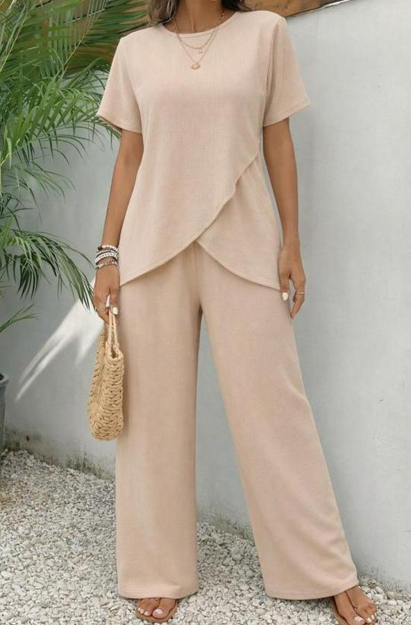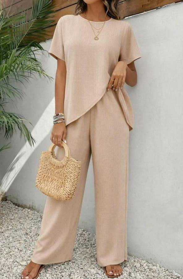 Kısa Kollu Bisiklet Yaka Asimetrik Kesim Detaylı Bürümcük Bluz Ve Pantolon Ikili Takım