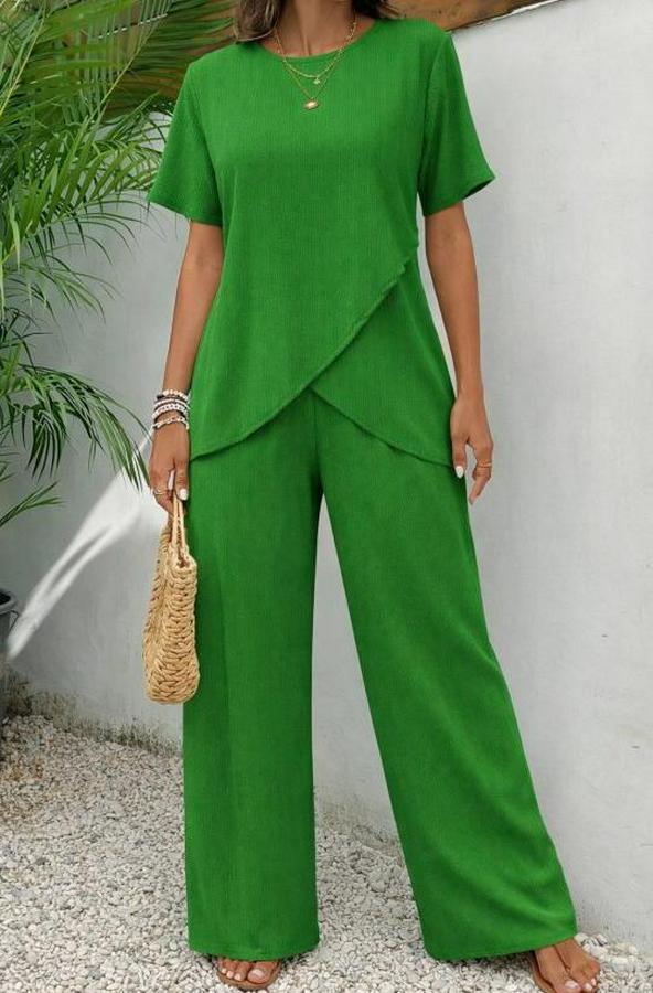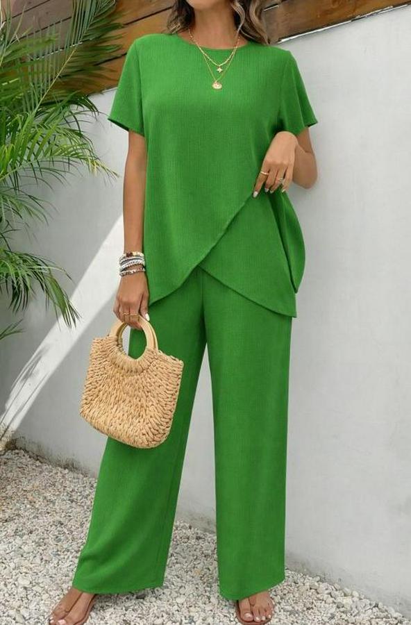 Kadın Kısa Kollu Bisiklet Yaka Asimetrik Kesim Detaylı Bürümcük Bluz Ve Pantolon Ikili Takım