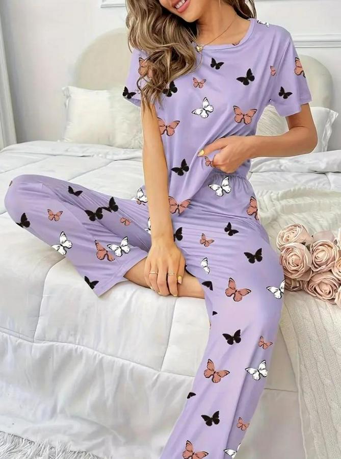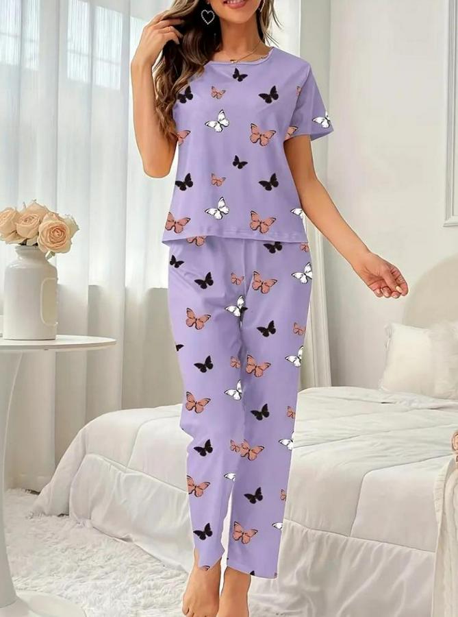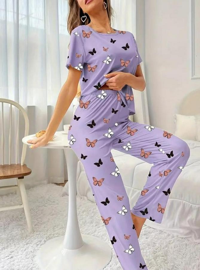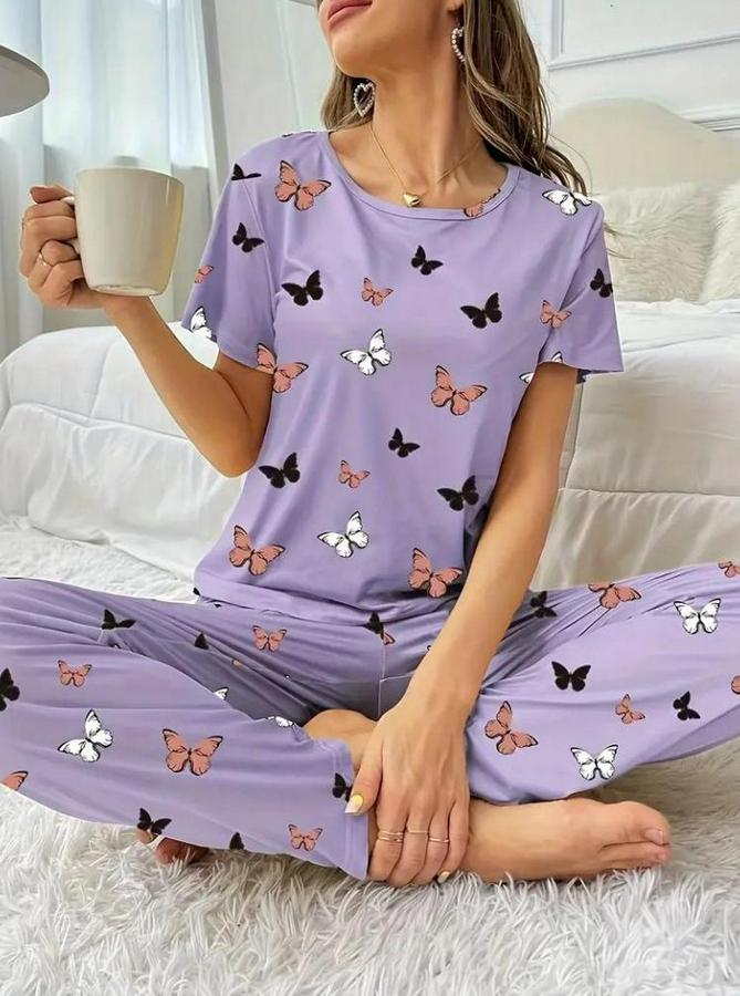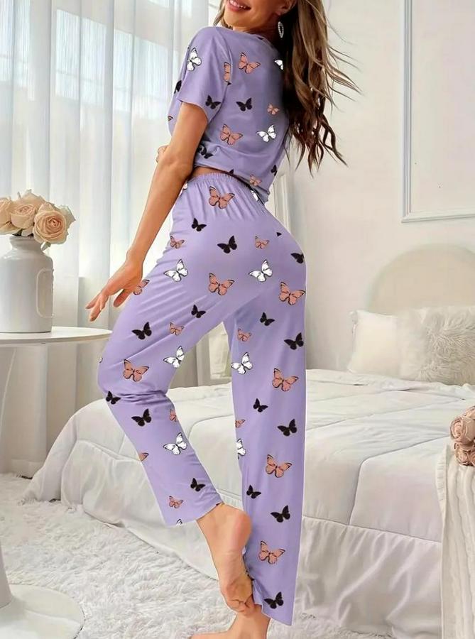 Kısa Kollu Bisiklet Yaka Kelebek Baskılı Süprem Ikili Takım