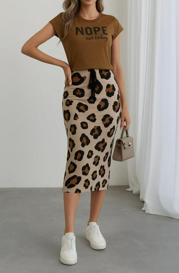 Kısa Kollu Bisiklet Yaka Viskon Bluz Desenli Dalgıç Etek Ikili Takım