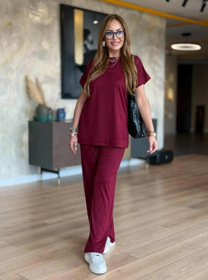Kısa Kollu Bisiklet Yaka Viskon Iki Iplik Bluz Ve Pantolon Ikili Takım