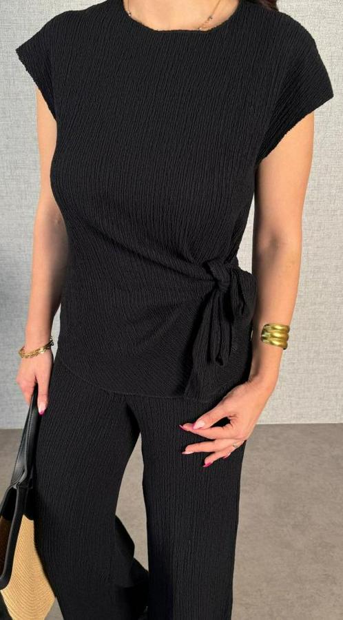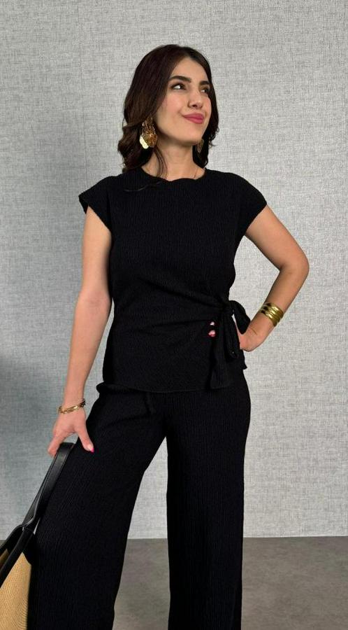 Kadın Kısa Kollu Bisiklet Yaka Yandan Bağlamalı Bürümcük Bluz Ve Pantolon Ikili Takım