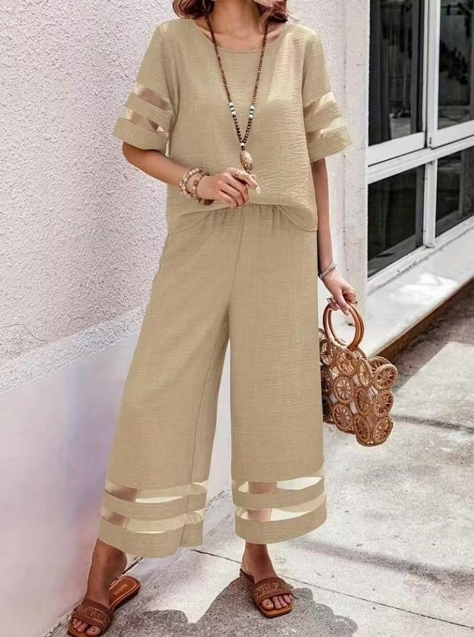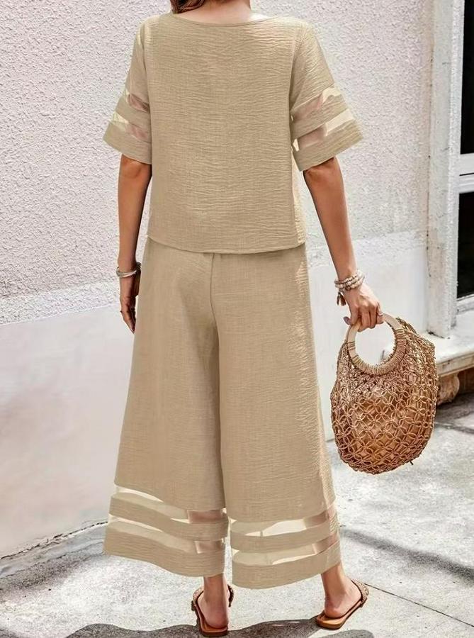 Kısa Kollu Bisiklet Yakalı Tül Şerit Detaylı Bluz Ve Pantolon Ikili Takım