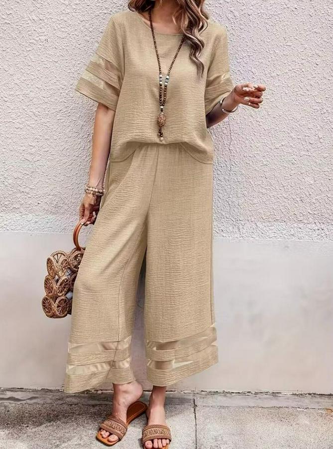 Kadın Kısa Kollu Bisiklet Yakalı Tül şerit Detaylı Bluz Ve Pantolon Ikili Takım