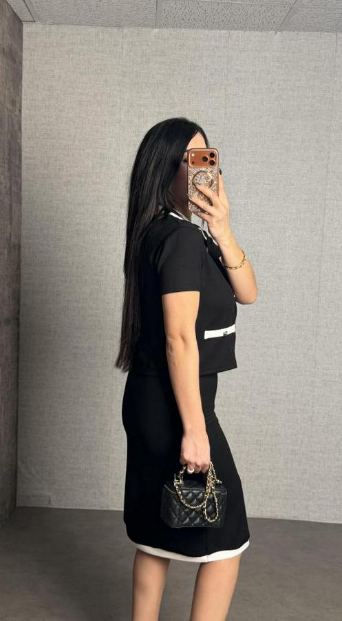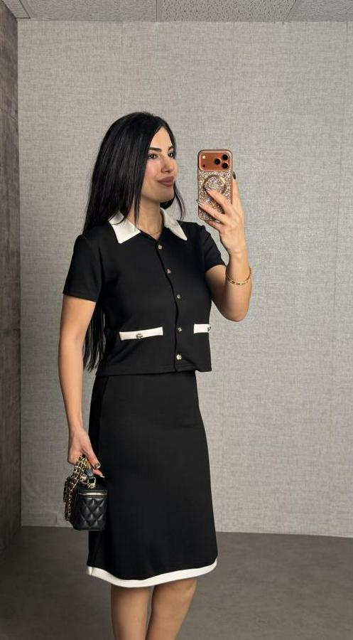 AnasayfaTüm ÜrünlerTakımlarAlt - Üst TakımKısa Kollu Cep Ve Düğme Detay Ceket Ve Diz Üstü Etek Ikili Takım