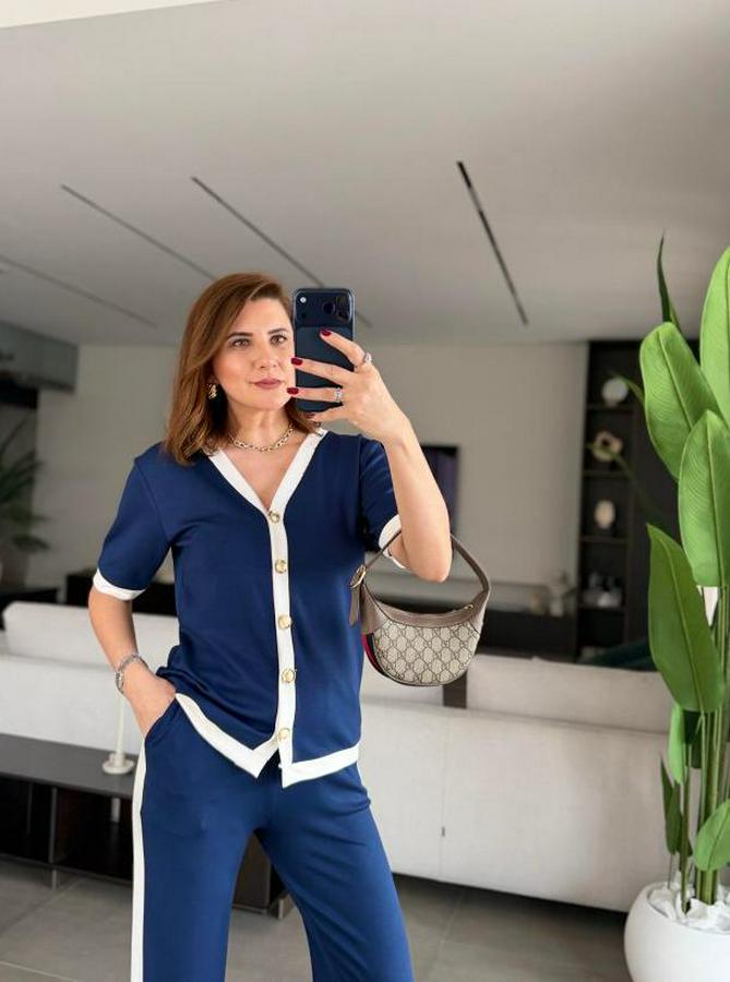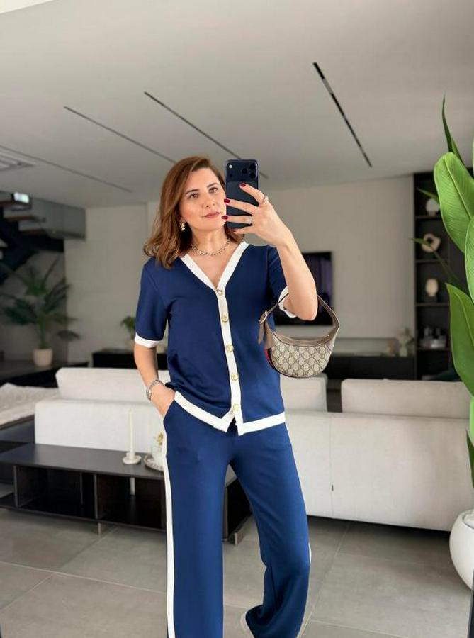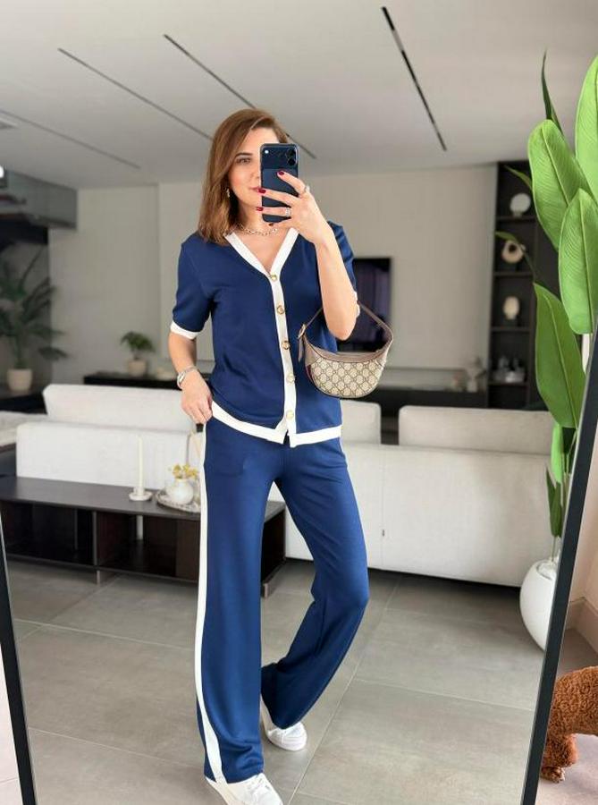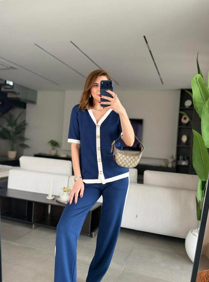 Kısa Kollu Ribana Ve Gold Düğme Detay Hırka Yanı Şeritli Pantolon Ikili Takım
