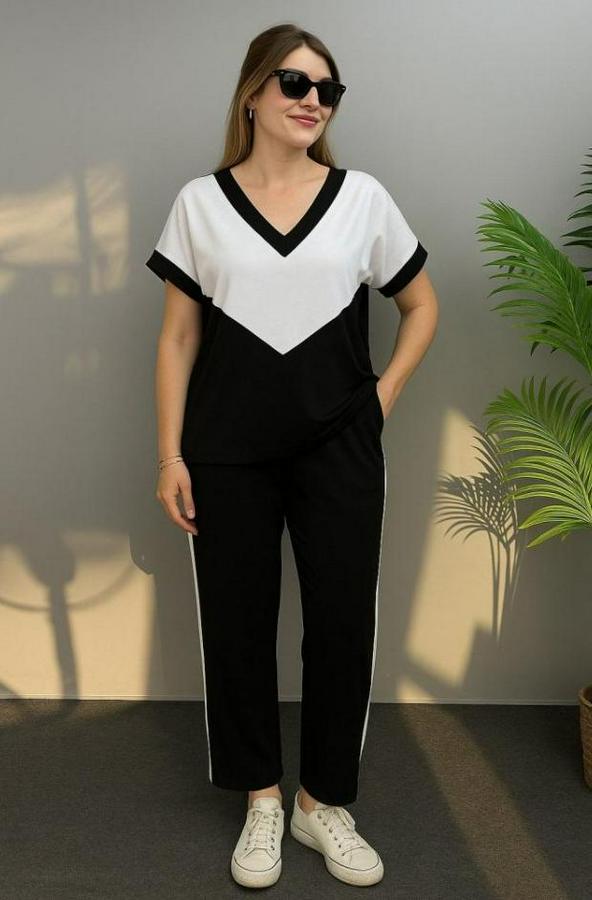 Kadın Kısa Kollu V Yaka Siyah Beyaz Renkli Viskon Iki Iplik Kumaş Eşofman Takımı