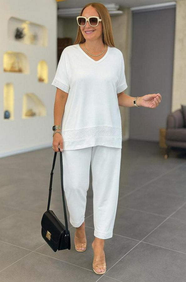 Kısa Kollu V Yakalı Pul Payetli Viskon Iki Iplik Bluz Ve Pantolon Ikili Takım