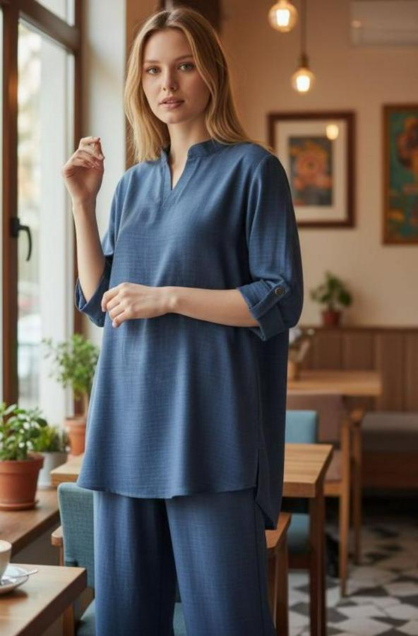 AnasayfaTüm ÜrünlerTakımlarAlt - Üst TakımKolu Katlanır Düğme Detay Hakim Yaka Bluzve Pantolon Sofia Keten Kumaş Ikili Takim