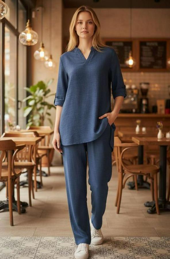 Kadın Kolu Katlanır Düğme Detay Hakim Yaka Bluzve Pantolon Sofia Keten Kumaş Ikili Takim