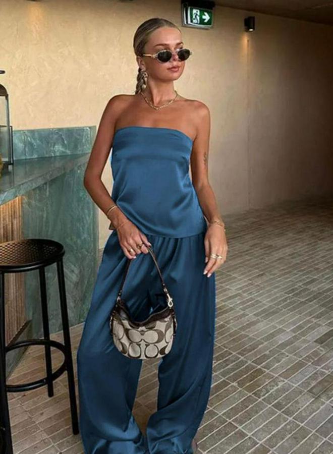 Likralı Saten Kumaş Straplez Bağlamalı Ikili Takım