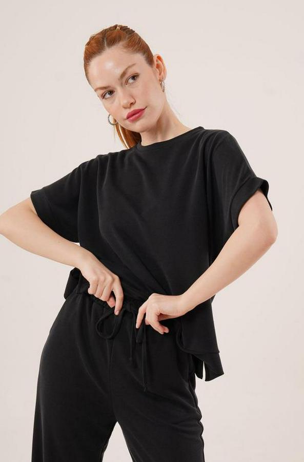 Modal Kısa Kollu Üst Ve Geniş Paça Eşofman Ikili Siyah Takım