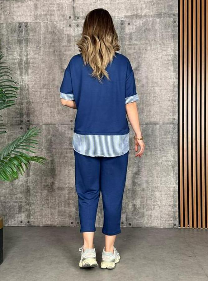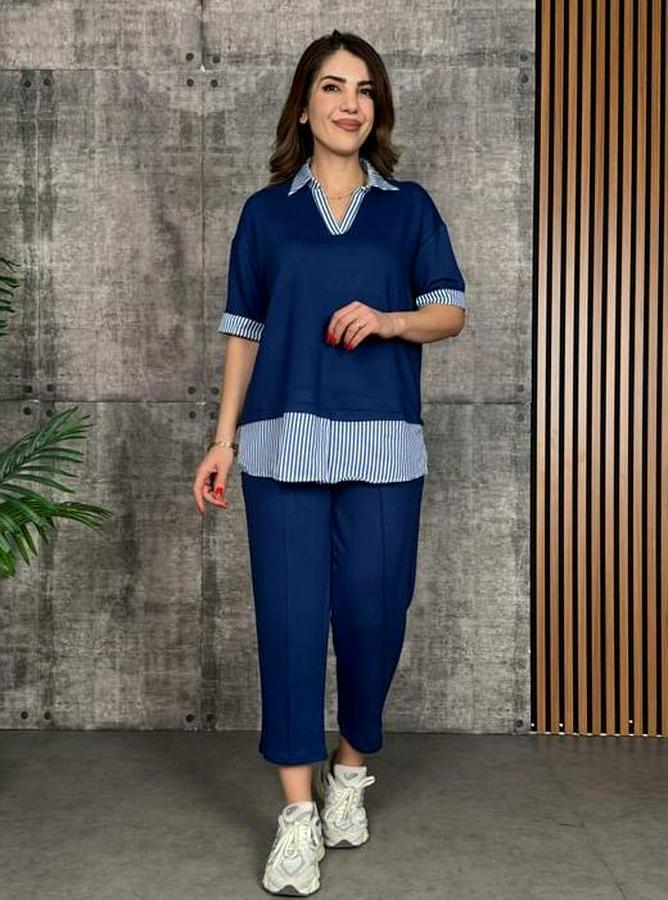 Kadın Modal Kumaş çizgili Gömlek Yaka Ikili Takım