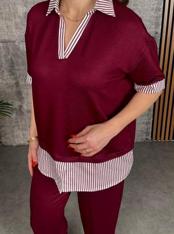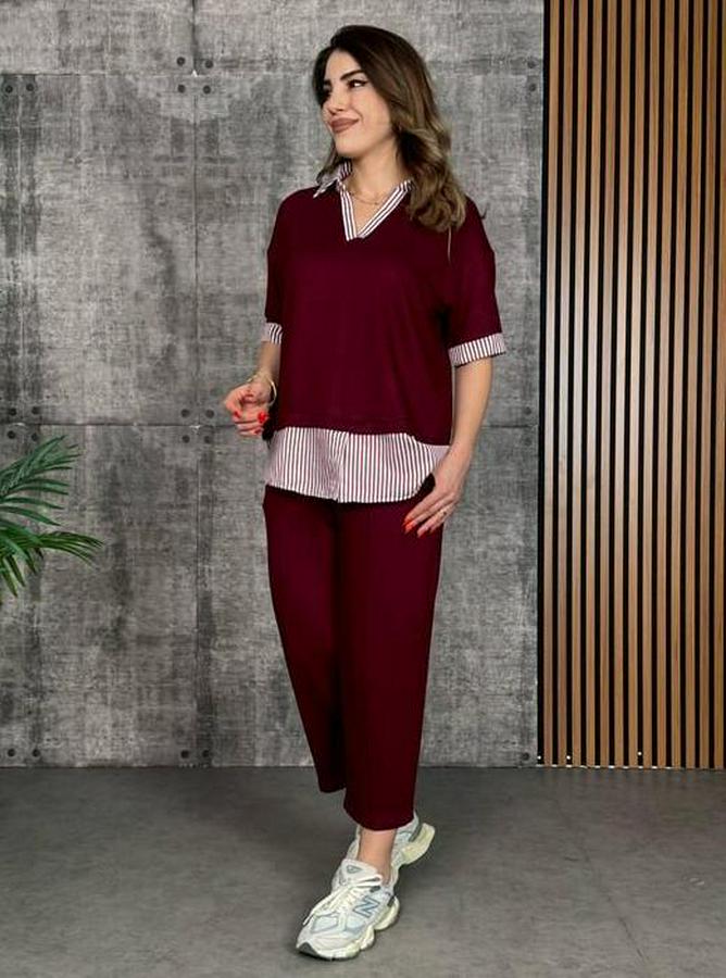 Kadın Modal Kumaş çizgili Gömlek Yaka Ikili Takım