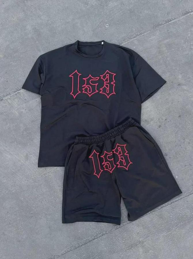 Erkek Nakış İşlemeli Şortlu Takım - Siyah