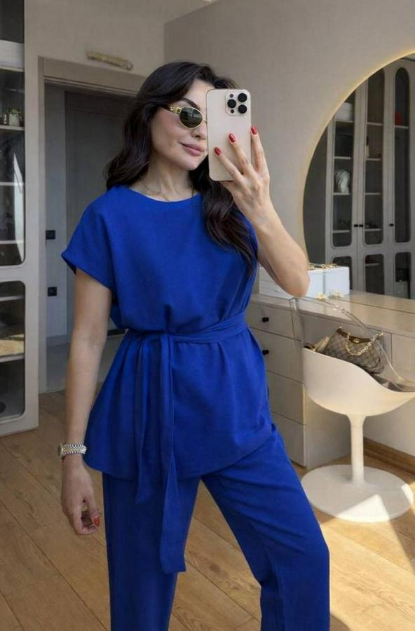 AnasayfaTüm ÜrünlerTakımlarAlt - Üst TakımOmuz Detay Kuşak Dahil Bluz Ve Pantolon Keten Kumaş Ikili Takım