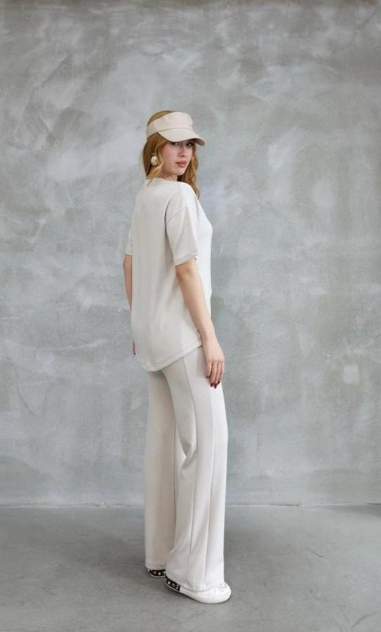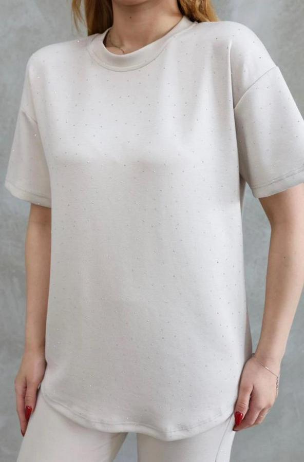 Osy Modal Yumuşak Dokulu Kumaş Bisiklet Yaka Taş Detaylı Kısa Kollu Takım - Kırık Beyaz