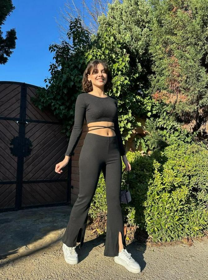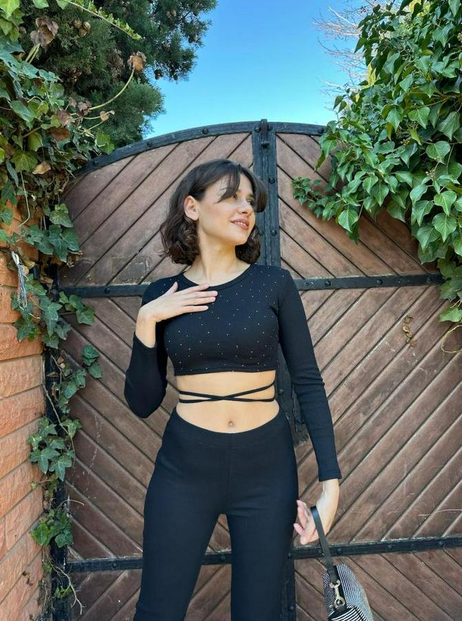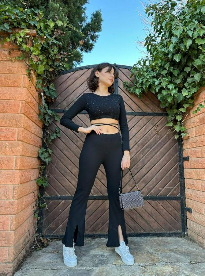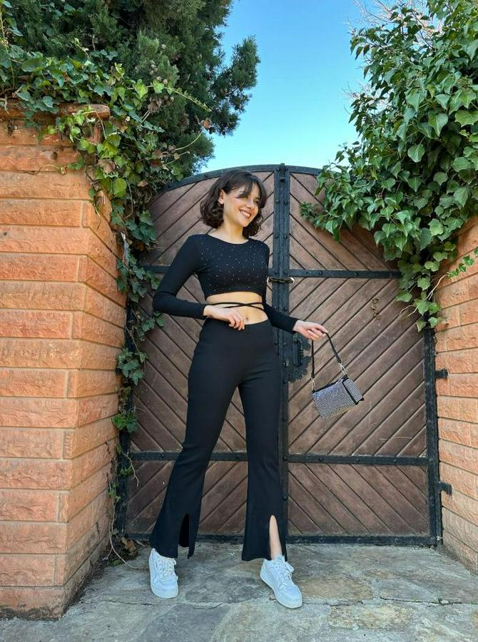 Kadın Paçası Yırtmaç Detaylı Taşlı Bel Bağlamalı Kaşkorse İkili Takım