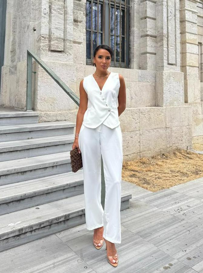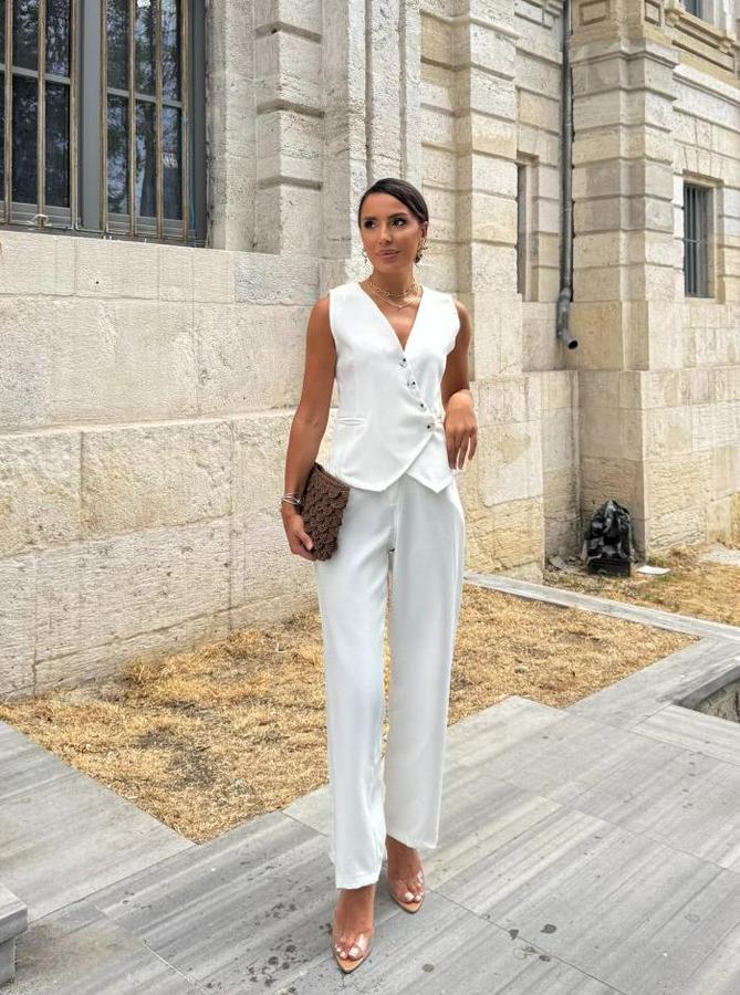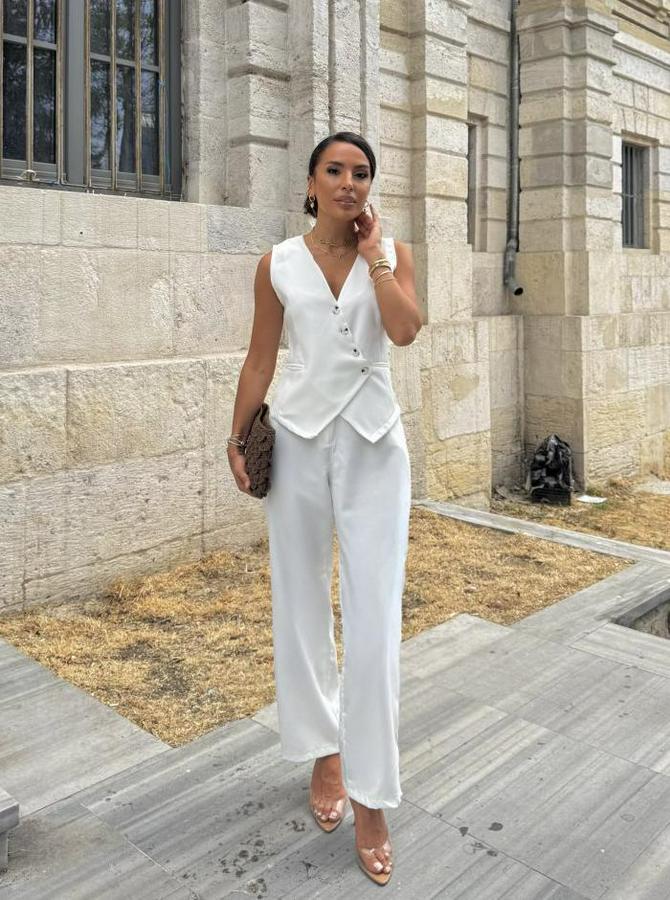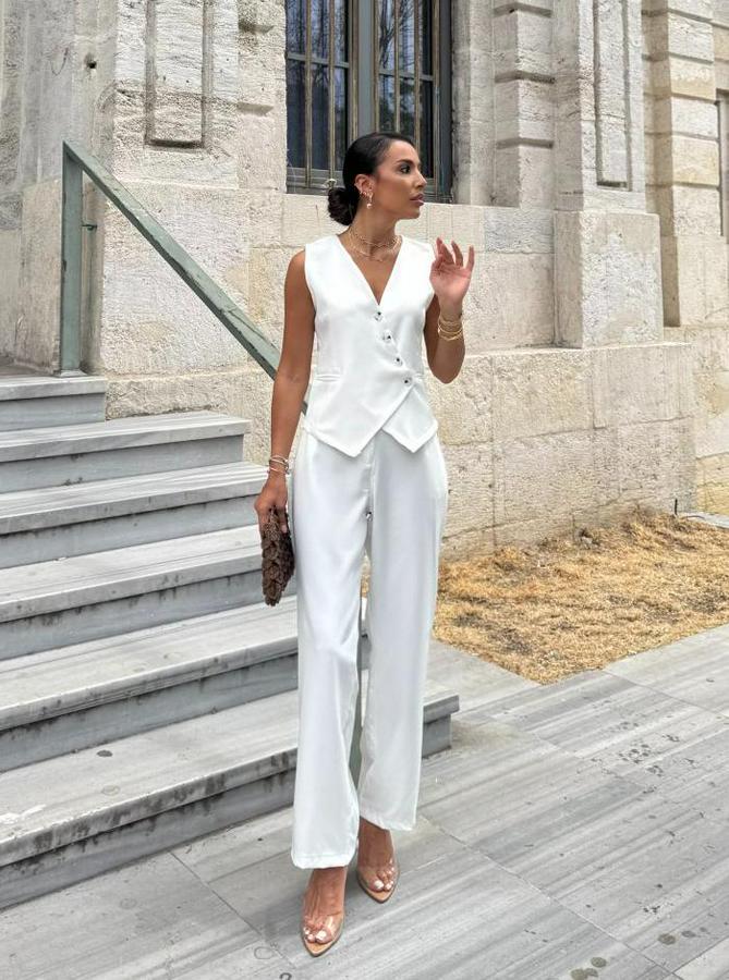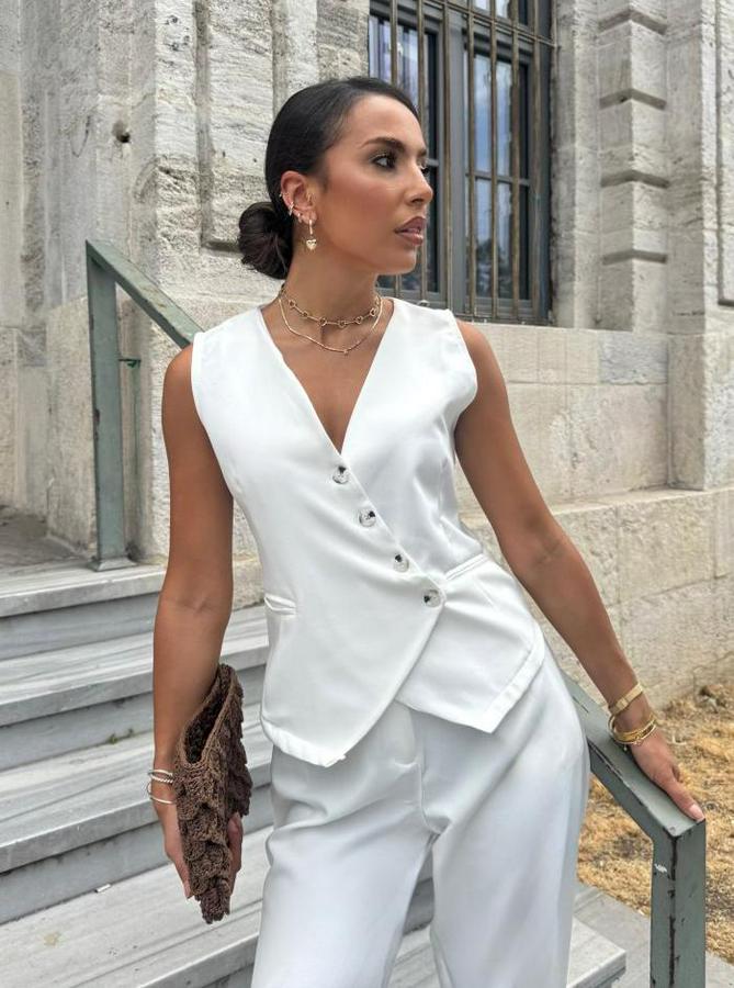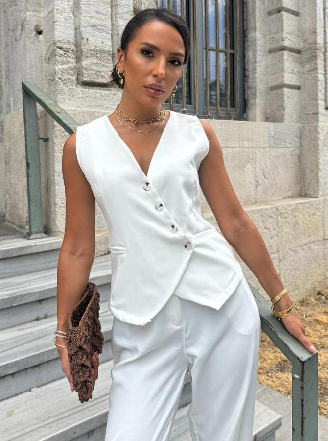 AnasayfaTüm ÜrünlerTakımlarAlt - Üst TakımSıfır Kollu Çapraz V Yakalı Önden Düğmeli Atlas Yelek Ve Pantolon Ikili Takım