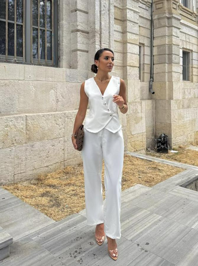Kadın Sıfır Kollu çapraz V Yakalı önden Düğmeli Atlas Yelek Ve Pantolon Ikili Takım