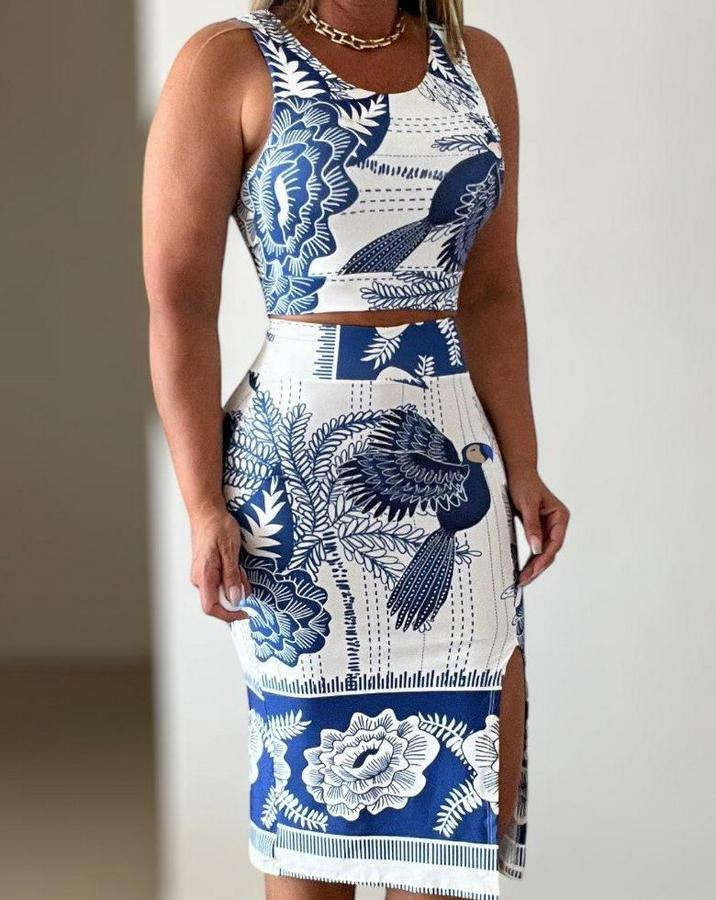Sıfır Kollu Yuvarlak Yaka Çiçekli Desenli Süprem Crop Ve Yırtmaçlı Etek Ikili Takım
