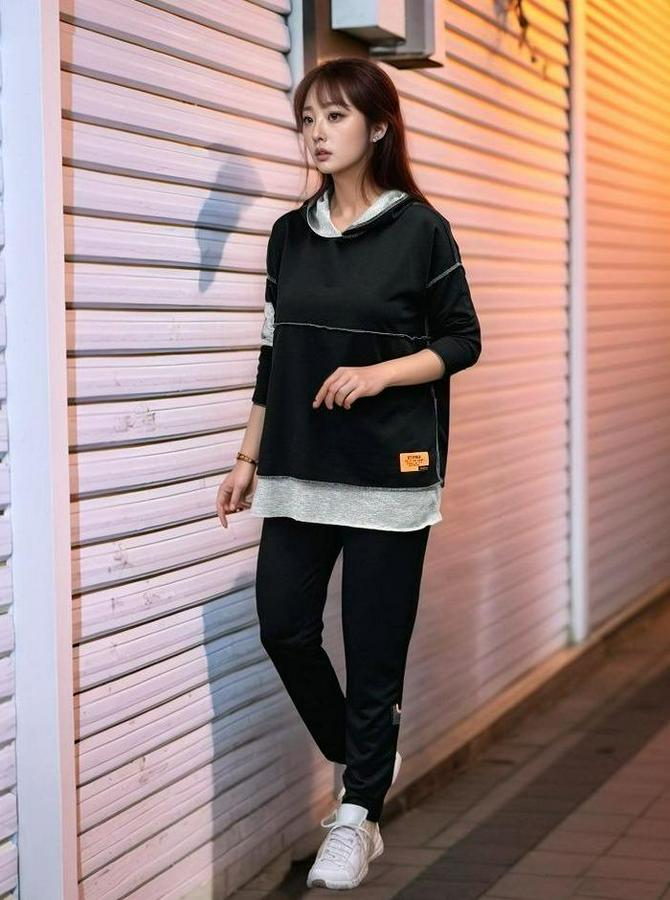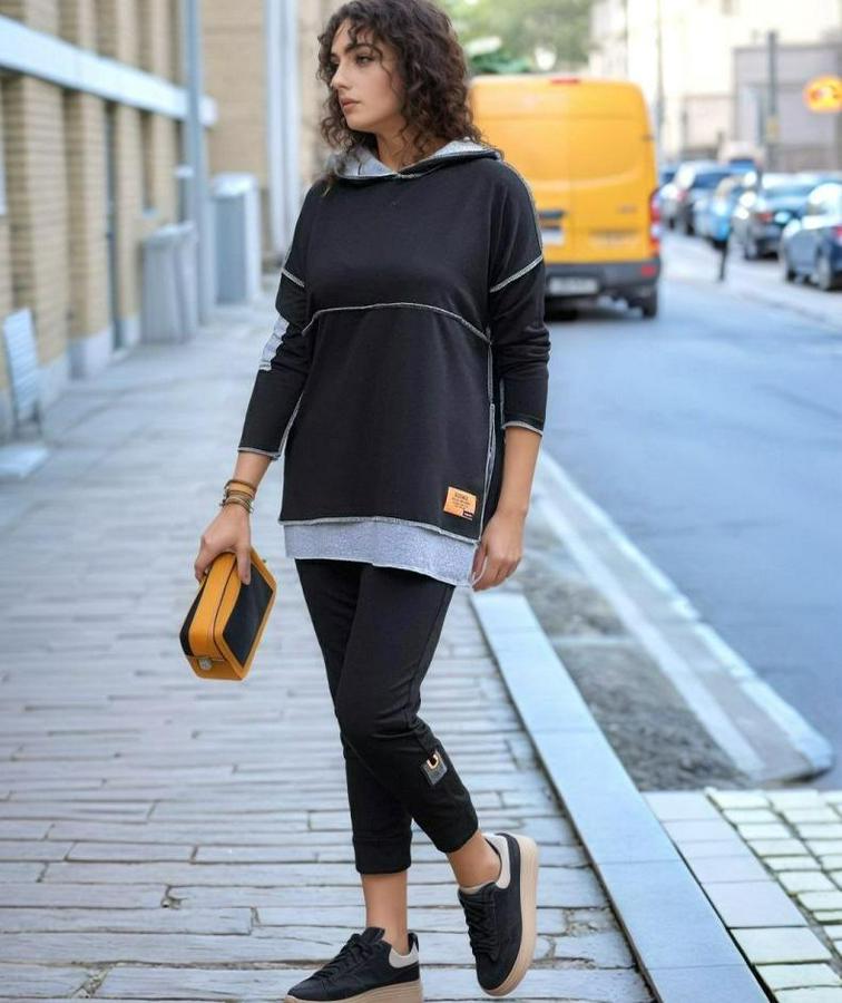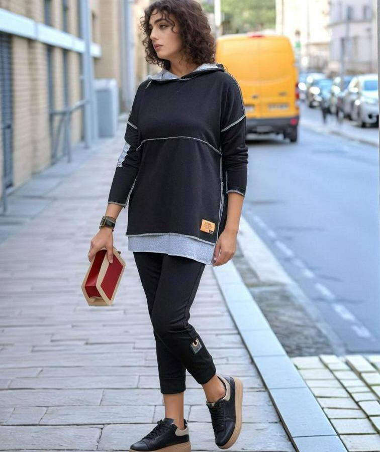 Kadın Siyah Kapşonlu Etek Ucu Detay Arma Ters Dikiş Gorunumlu Ikili Takım