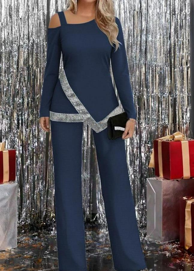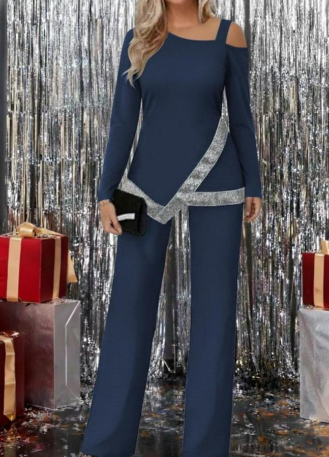 Kadın Tek Omuzdan Açık Uzun Kollu önü Pulpayet Ithal Krep Bluz Ve Pantolon