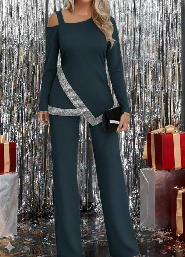 Kadın Tek Omuzdan Açık Uzun Kollu önü Pulpayet Ithal Krep Bluz Ve Pantolon