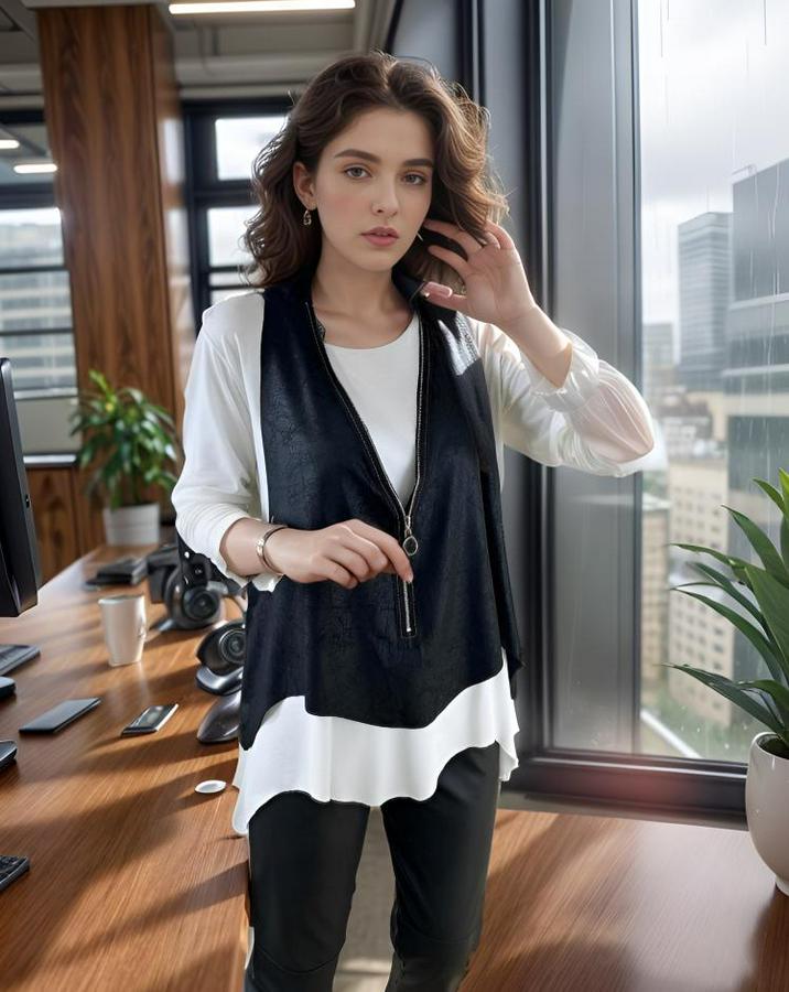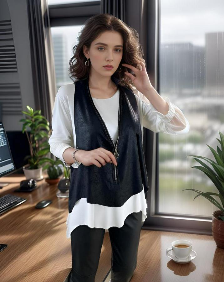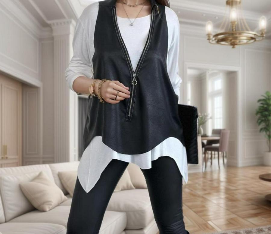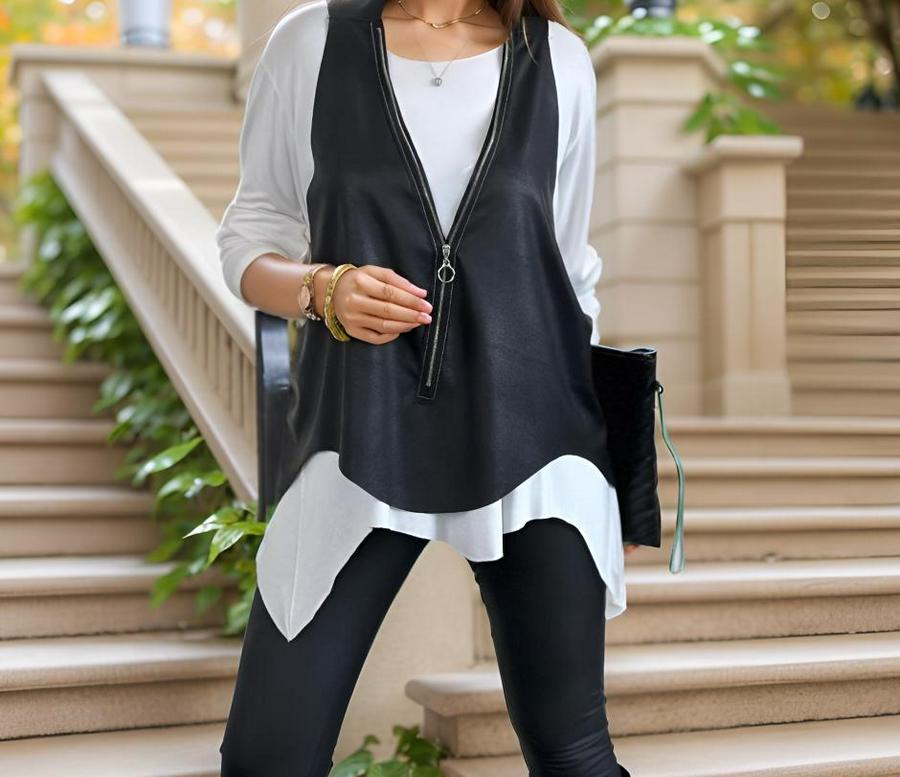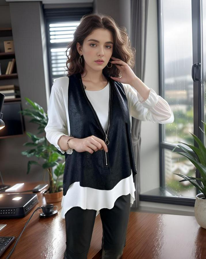 Kadın Uzun Kol Asimetrik Kesim Viskon Bluz Ve çatlak Deri Görünümlü Fermuar Detaylı Yelek Ikili Takım