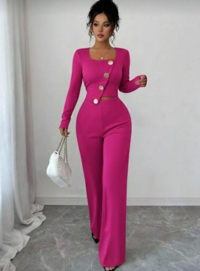 Uzun Kol Kare Yaka Asimetrik Düğme Detay Bluz Ve Yüksek Bel Pantolon Ikili Takım