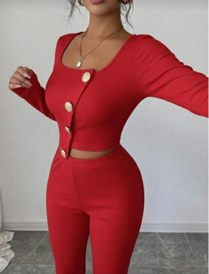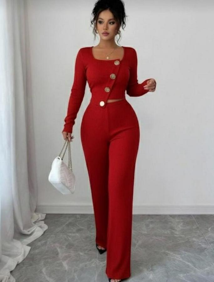 AnasayfaTüm ÜrünlerTakımlarAlt - Üst TakımUzun Kol Kare Yaka Asimetrik Düğme Detay Bluz Ve Yüksek Bel Pantolon Ikili Takım