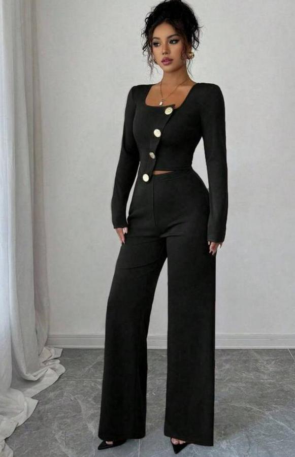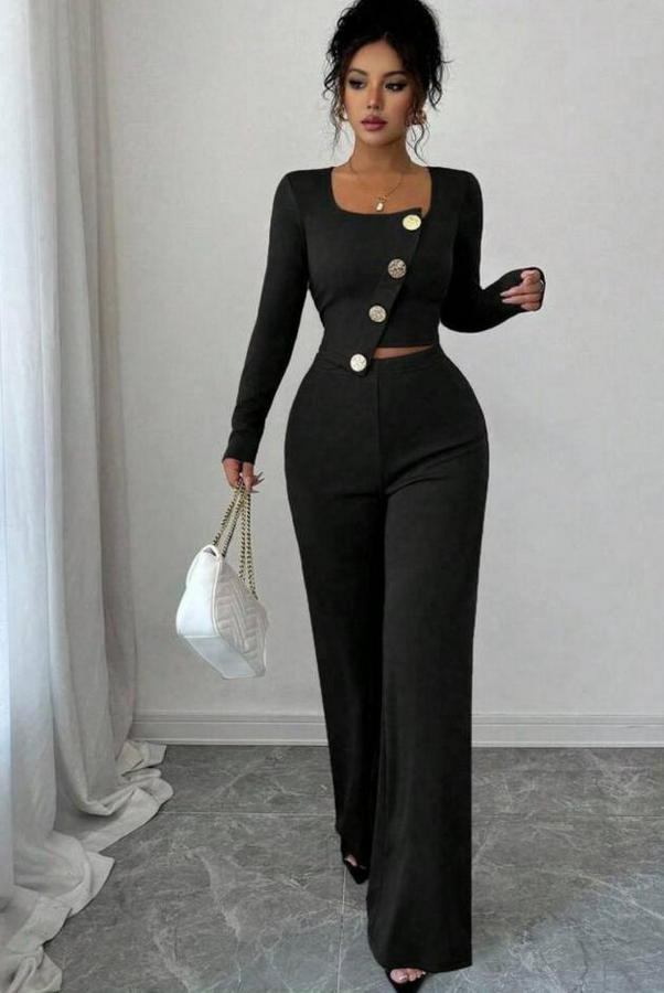 AnasayfaTüm ÜrünlerTakımlarAlt - Üst TakımUzun Kol Kare Yaka Asimetrik Düğme Detay Bluz Ve Yüksek Bel Pantolon Ikili Takım
