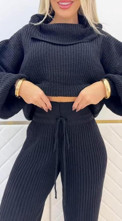 Kadın Uzun Kollu Balıkçı Yaka Kısa Triko Bluz Ve Pantolon Ikili Takım