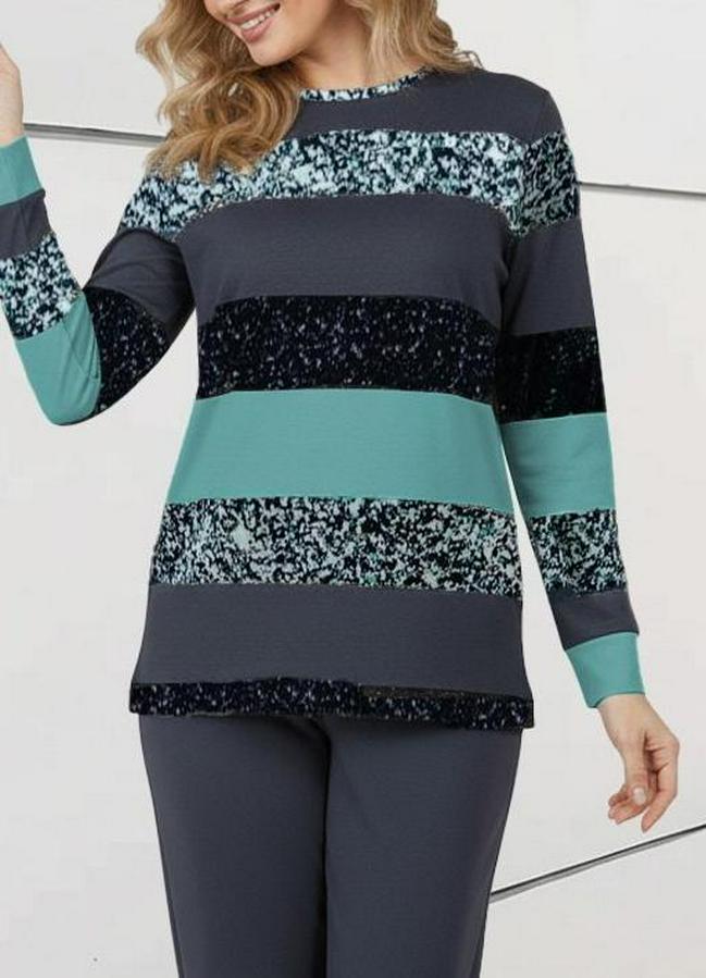 Kadın Uzun Kollu Bisiklet Yaka çizgili Desen Iki Iplik Bluz Ve Pantolon Ikili Takım