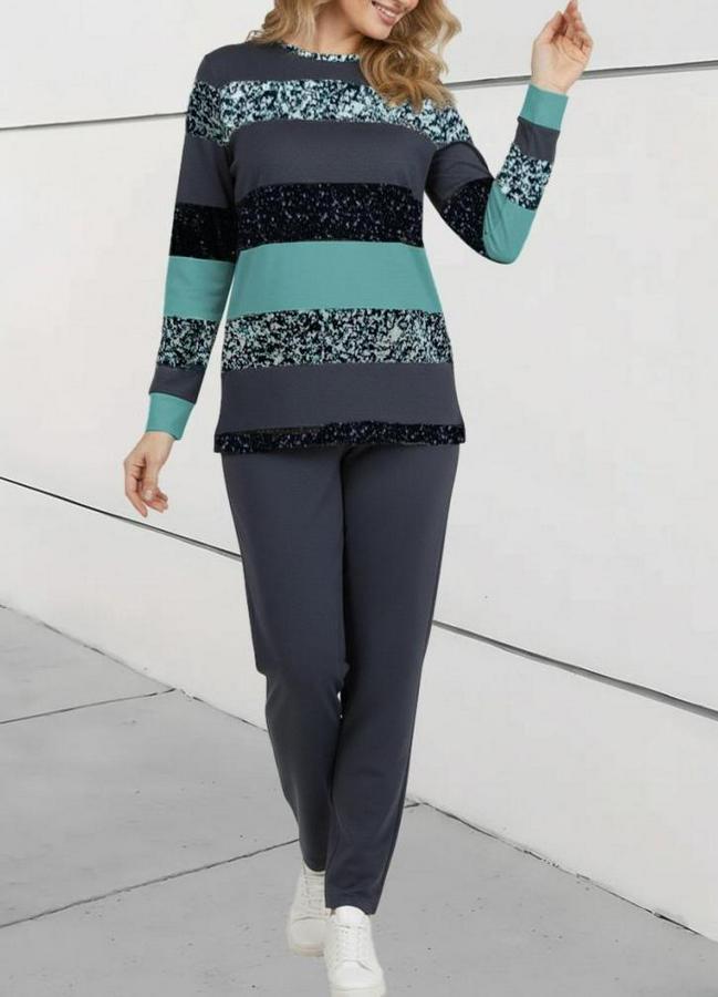 Uzun Kollu Bisiklet Yaka Çizgili Desen Iki Iplik Bluz Ve Pantolon Ikili Takım