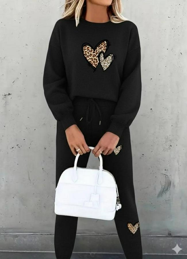 Uzun Kollu Bisiklet Yaka Kalp Desenli Şardonlu Üç Iplik Bluz Ve Pantolon Ikili Takım