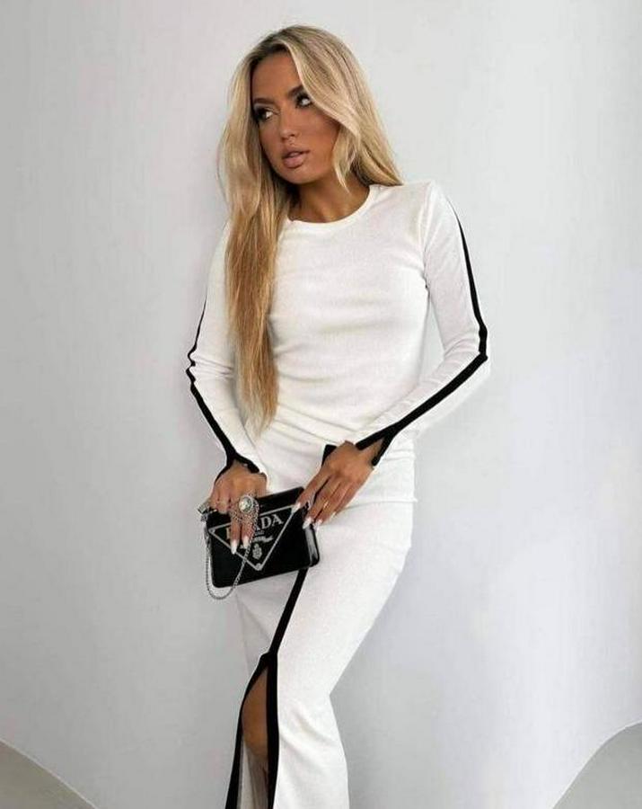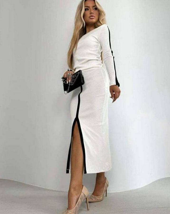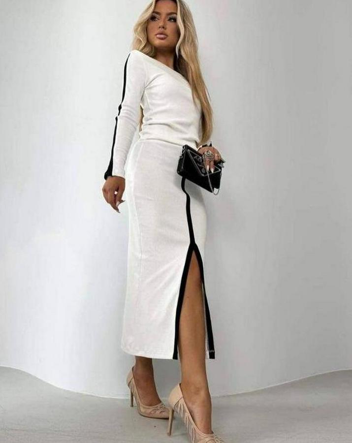 Uzun Kollu Bisiklet Yaka Kaşkorse Bluz Ve Yırtmaçlı Etek Ikili Takım