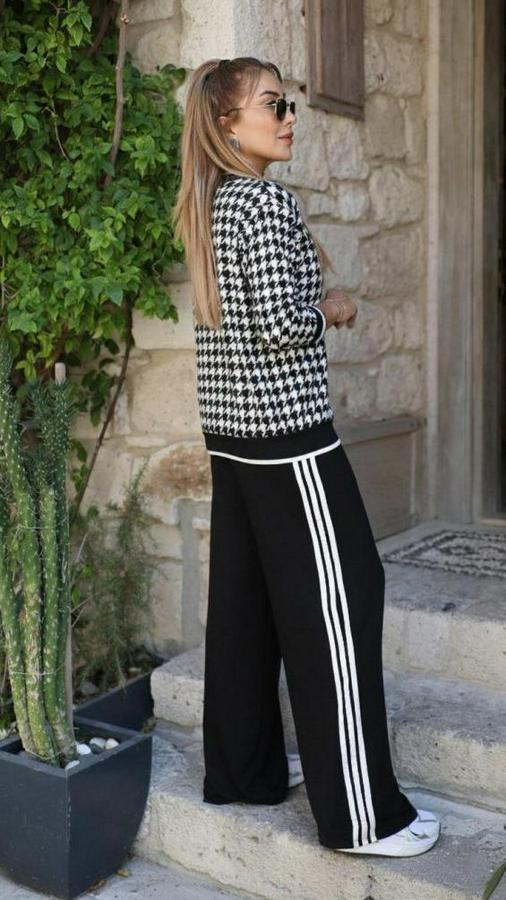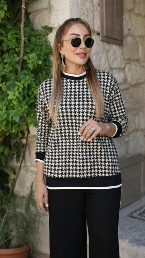 Uzun Kollu Bisiklet Yaka Kazayağı Desenli Iki Iplik Bluz Ve Viskon Iki Iplik Pantolon Ikili Takım